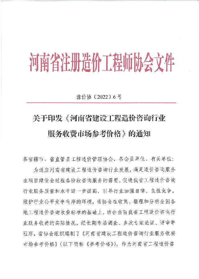 关于印发《河南省建设工程造价咨询行业服务收费市场参考价格》的通知