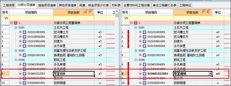 ① 分别点击送审工程(左侧)与审定工程(右侧)的清单项目,将光标停留在对应的清单上;