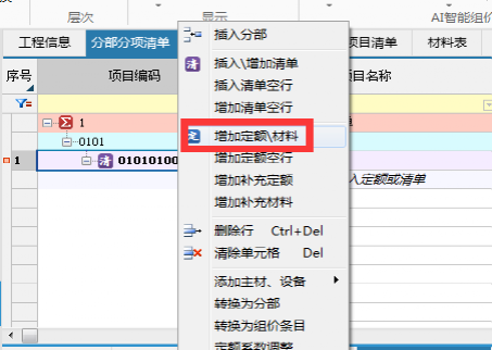 1、清单上--鼠标右键选择增加定额;